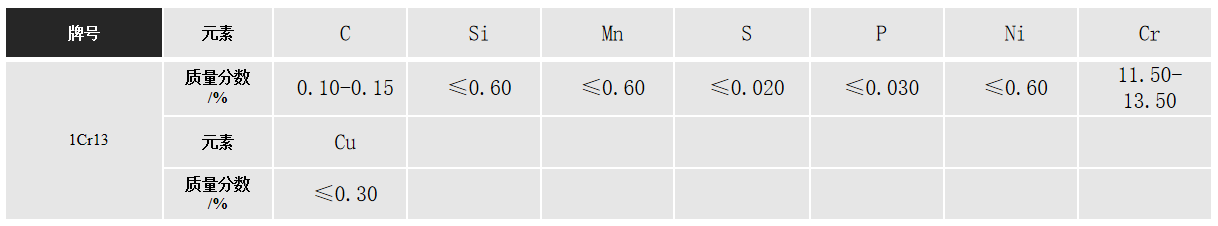 作為馬氏體不銹鋼,1Cr13也通過淬火和高溫回火而獲得較高的強(qiáng)度和良好的韌性。本鋼種通常與2Cr13、3Cr13、4Cr13相比較,是四個(gè)牌號中碳含量最低者,因此強(qiáng)度也最低,而塑韌性最優(yōu)。